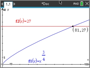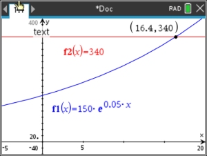 Proceed as in #2.  Be sure to adjust the window to allow for a y-value of 27.  Also notice the need to move to the right to find the intersection.
