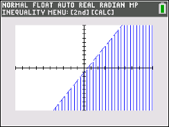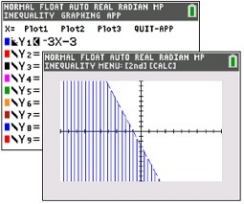 The option choice for Example 1 will look like a right triangle shaded above the regular-appearing slanted line. The draw back to this method is that the calculator will not distinguish between a solid line (for >) and a dotted line (for >) on the graph. All calculator lines are solid. You will need to know when to use solid versus dotted lines.