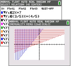 After entering the first inequality in the APP, arrow down, arrow left for box, ENTER, and begin the process again for the second inequality. When both are entered, hit GRAPH.